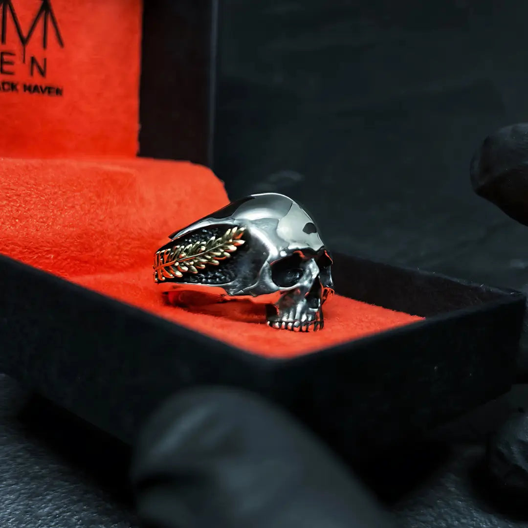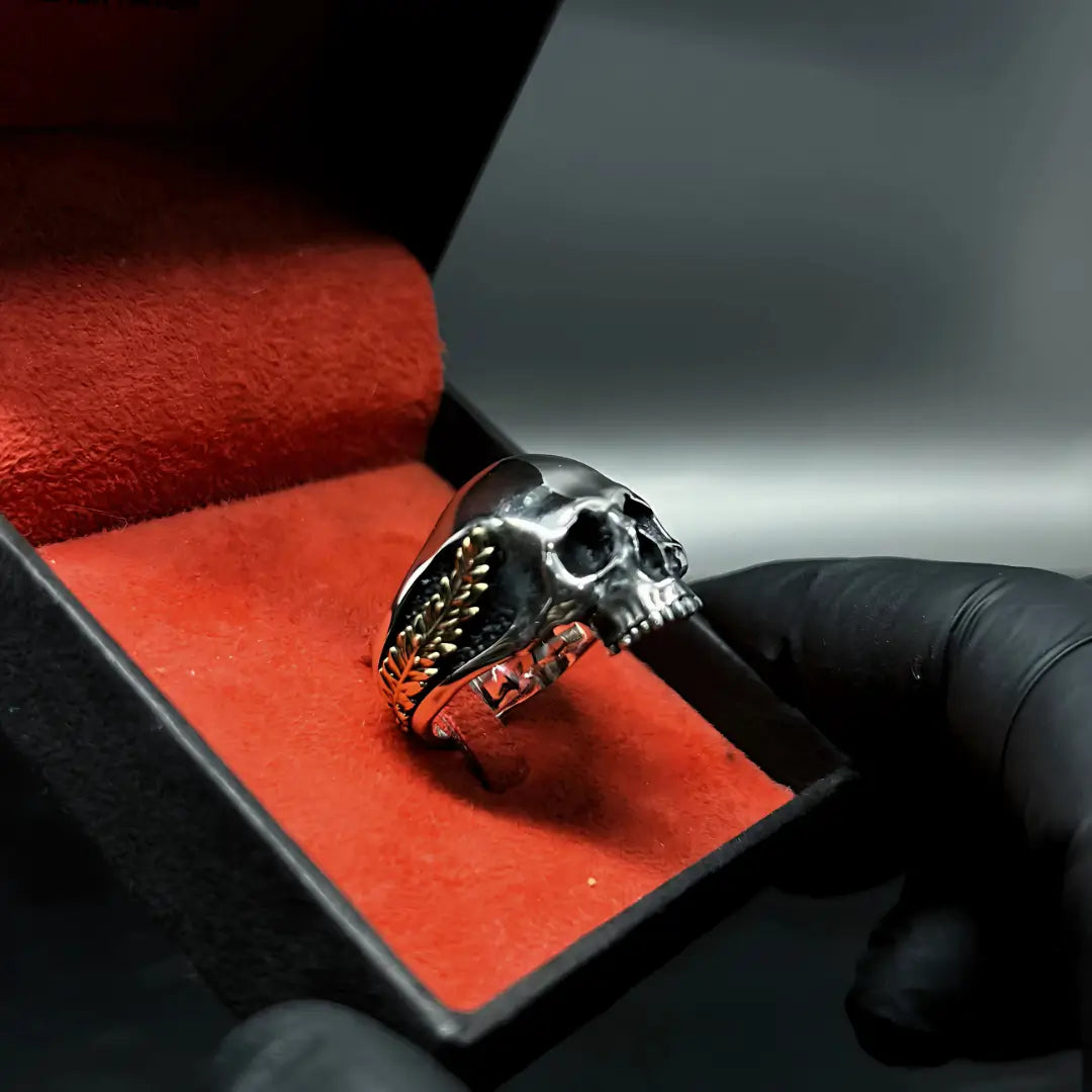 •Imagine um anel meticulosamente esculpido em prata ou ouro, cujo destaque central é um crânio detalhado, uma representação vívida da morte. No entanto, em volta deste crânio, intrincados ramos de louro são habilmente entrelaçados, evocando os triunfos e conquistas típicos dos imperadores romanos.