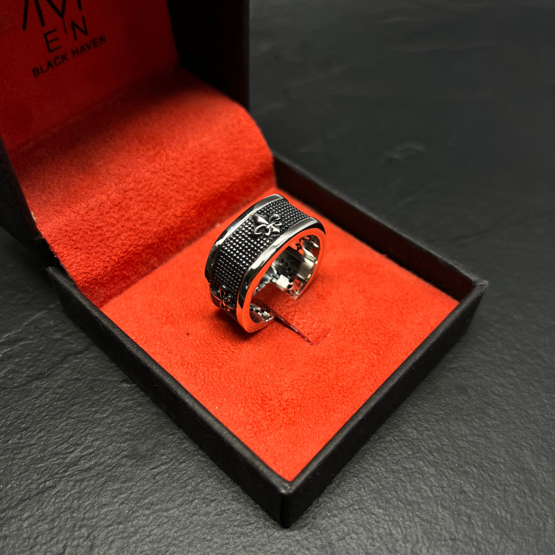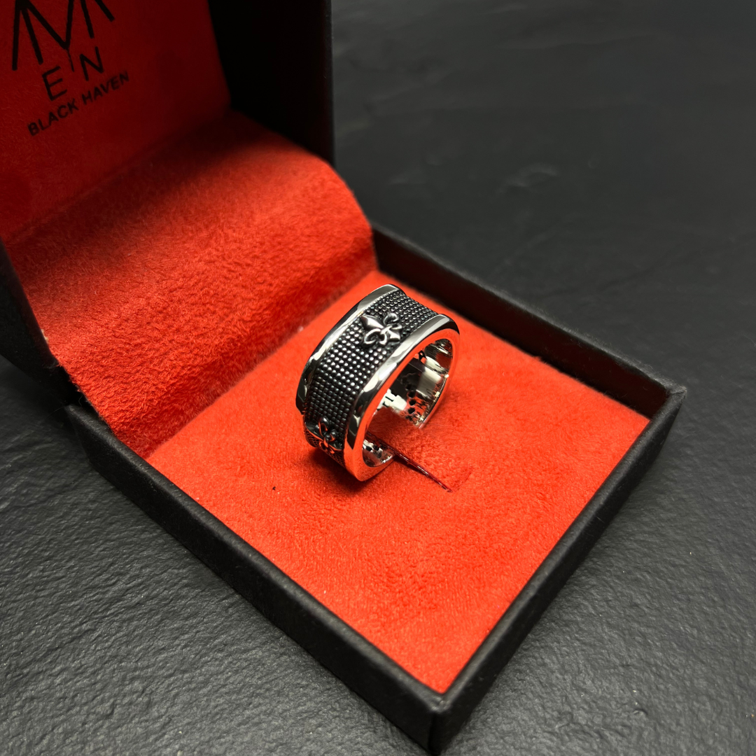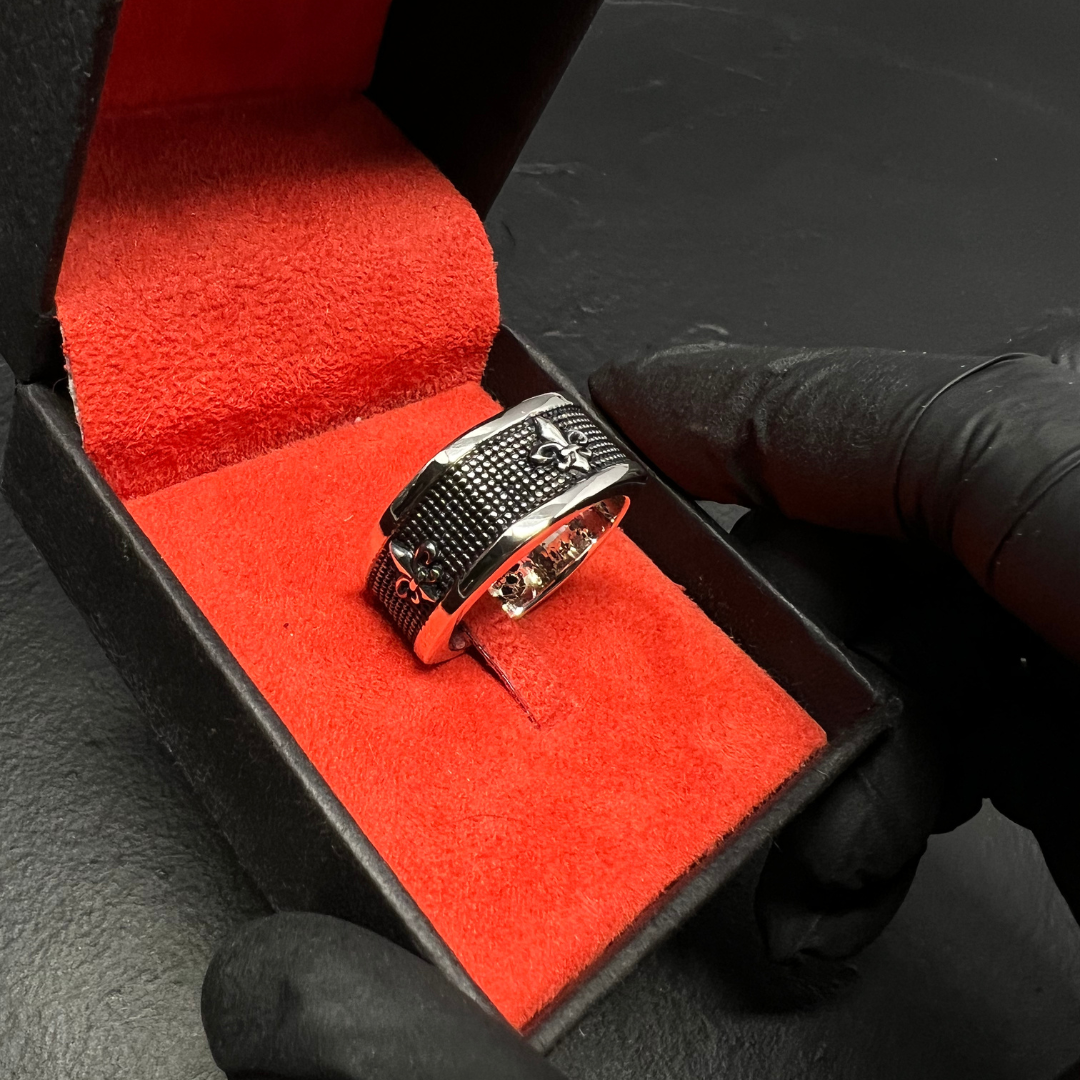 •Imagine, se você puder, um anel meticulosamente trabalhado em ouro ou prata, cuja superfície é adornada com a emblemática flor de lis, um símbolo icônico da monarquia francesa e da nobreza. A flor de lis é esculpida com precisão, seus contornos elegantes e suas três pétalas refletem a perfeição do design real.