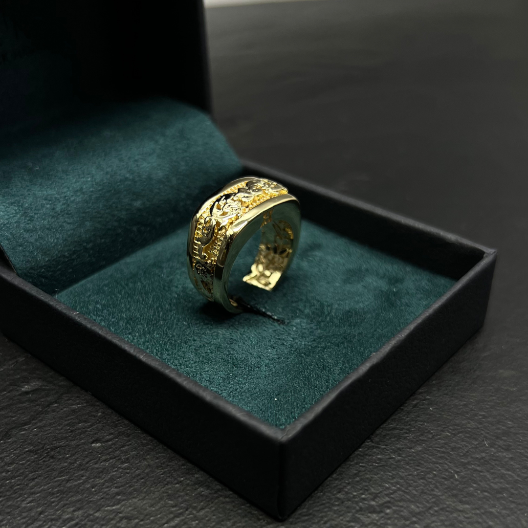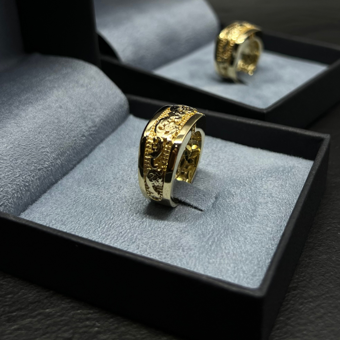 •Anel inspirado nos arabescos do Templo Parthenon é uma celebração da magnificência da arquitetura clássica grega e da elegância atemporal de seus padrões ornamentais.