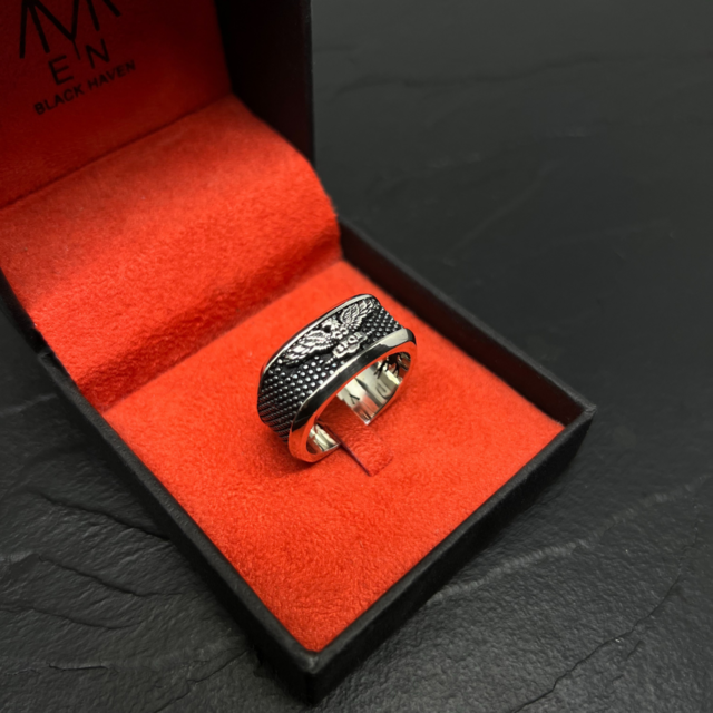 Os detalhes são tão intrincados que cada pena da águia e cada fio da crina dos leões parecem ganhar vida à medida que a luz incide sobre o anel.