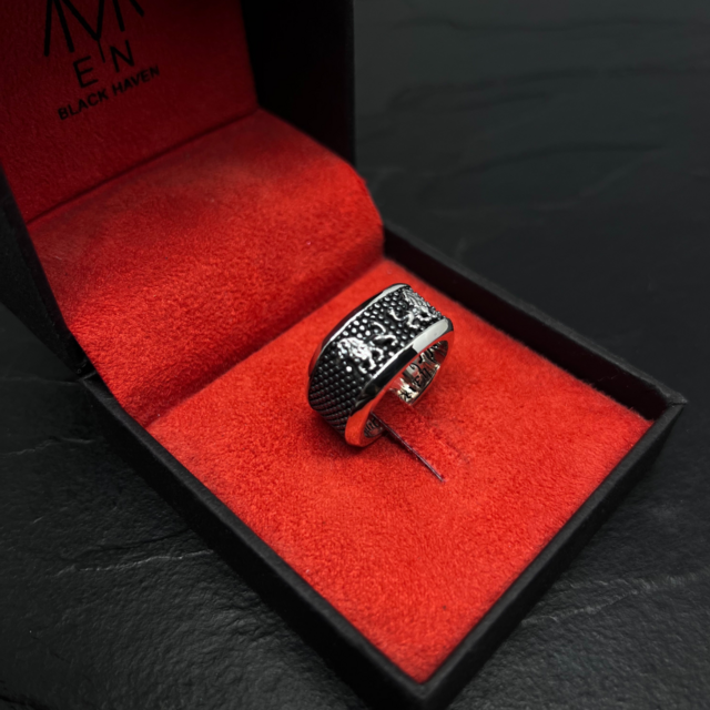 •Além disso, os escorpiões da Guarda Pretoriana, conhecida por sua lealdade ao imperador, adornam a parte interna do anel, lembrando-nos das complexidades e intrigas da política romana. Os escorpiões, com suas garras afiadas, representam a vigilância constante necessária para manter o poder e a ordem em um império tão vasto.