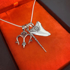 • Tridente de Poseidon: O tridente de Poseidon, uma arma icônica do deus dos mares, é o terceiro pingente deste colar extraordinário.